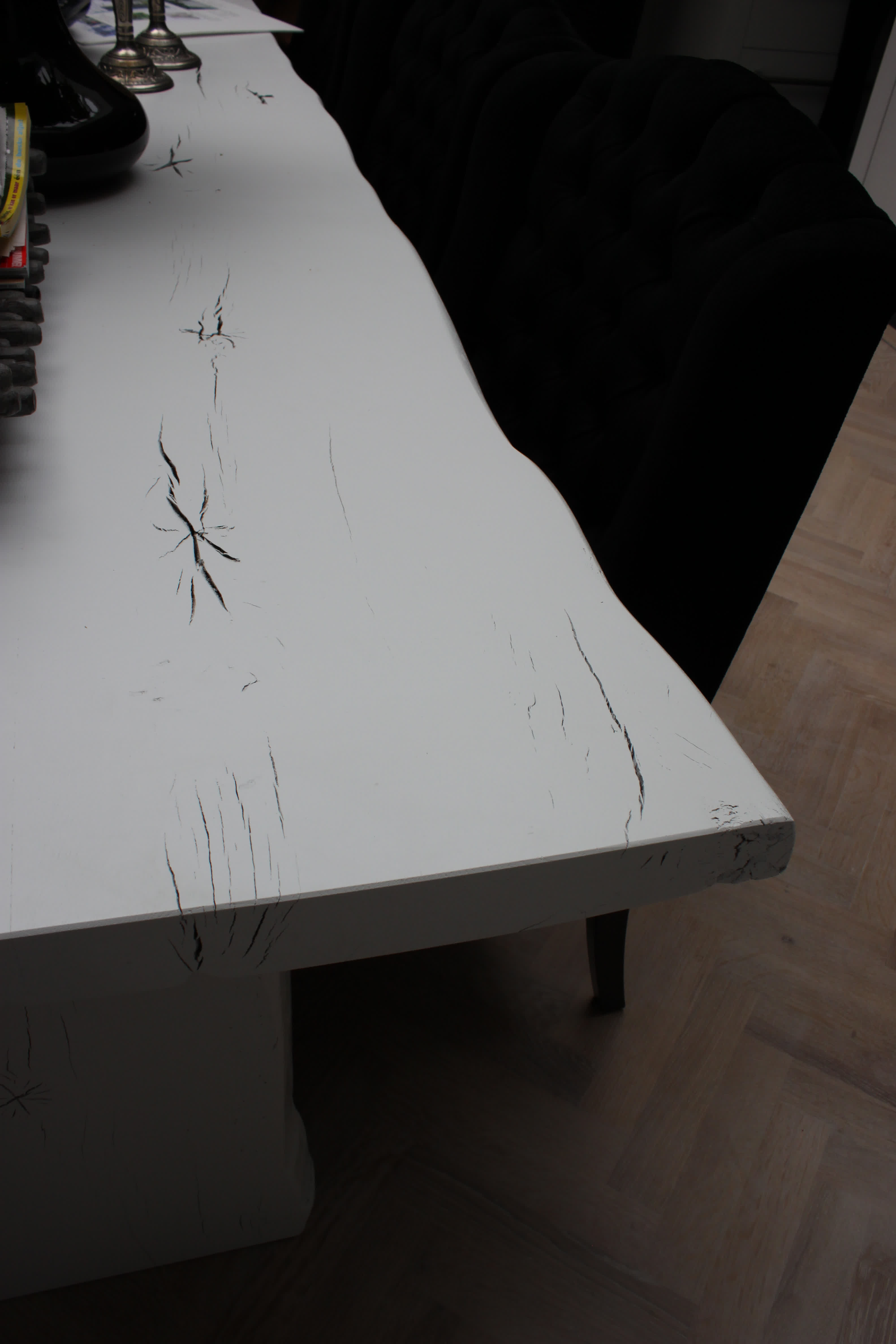 Deze boomstamtafel is gemaakt van eikenhout met de schorsranden van de boom intact gelaten. De tafel heeft rechte poten, die zijn afgeleid van het blad.