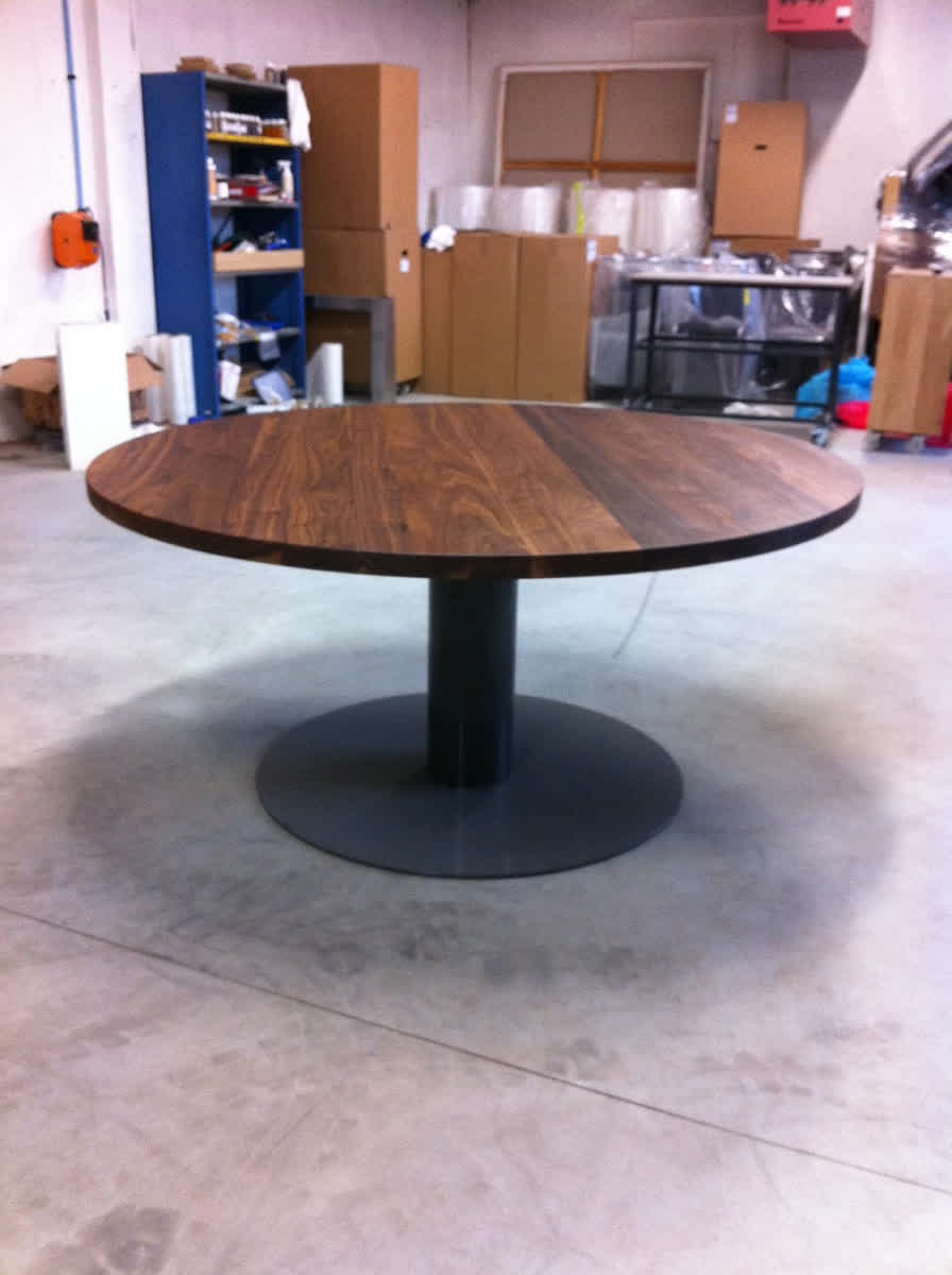 Het blad van deze eettafel kan gemaakt worden van diverse houtsoorten. De stalen poot is afgewerkt met een hardwax olie.