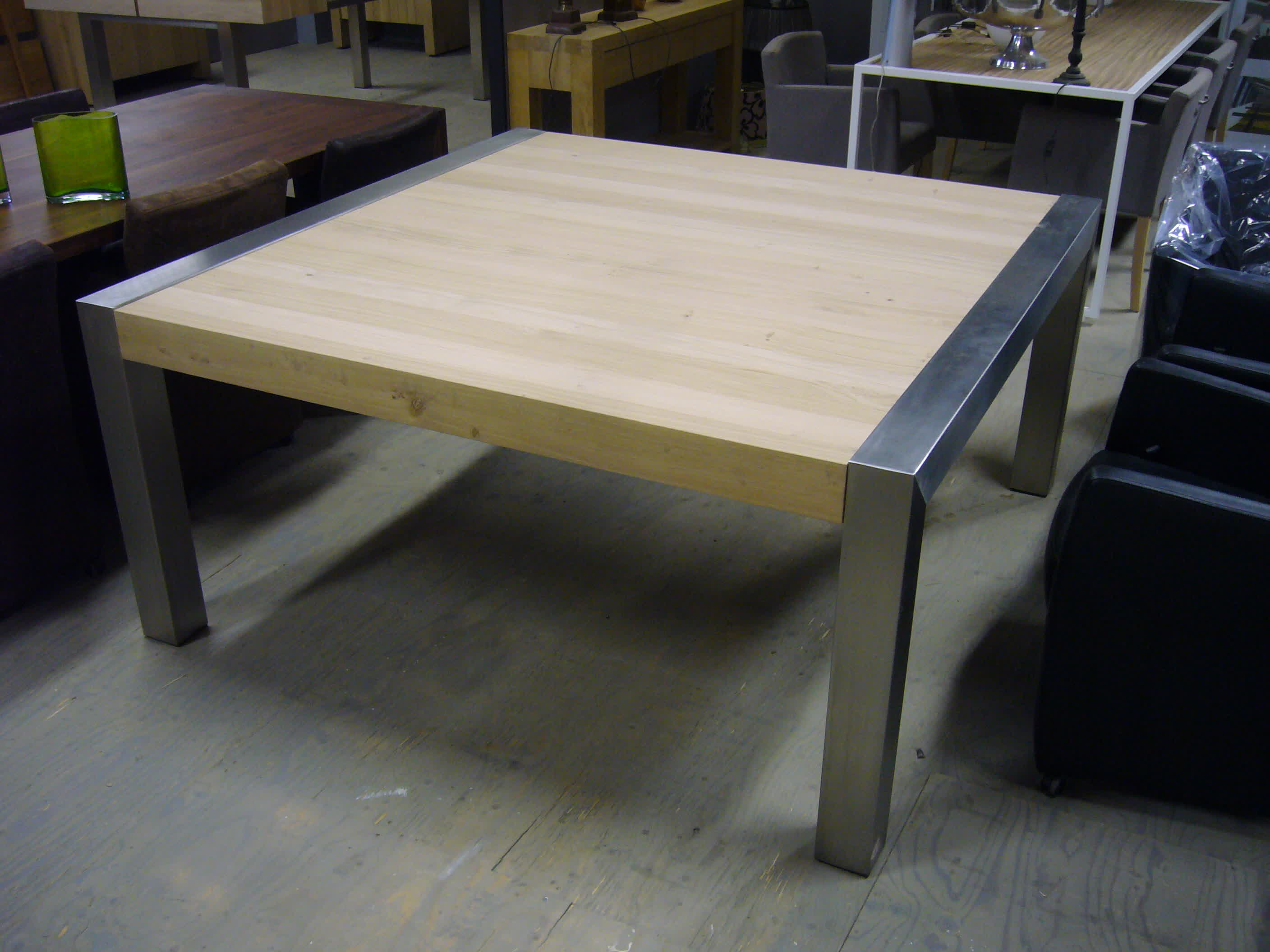 Deze vierkante tafel in de maten 150 x 150 cm is gemaakt van een RVS frame is verstek gelast. Het blad ligt tussen het frame en heeft dezelfde dikte (opgedikt) als de poten/regels. De poten en het opgedikte blad hebben een dikte van 12cm. Dit kan uiteraard ook in andere maten.