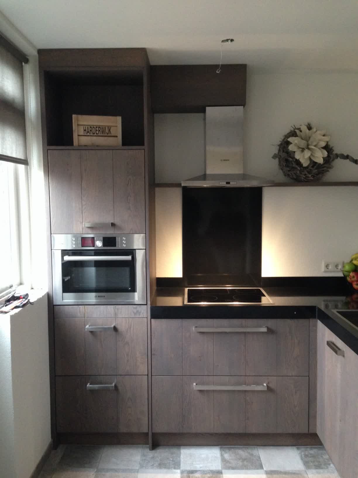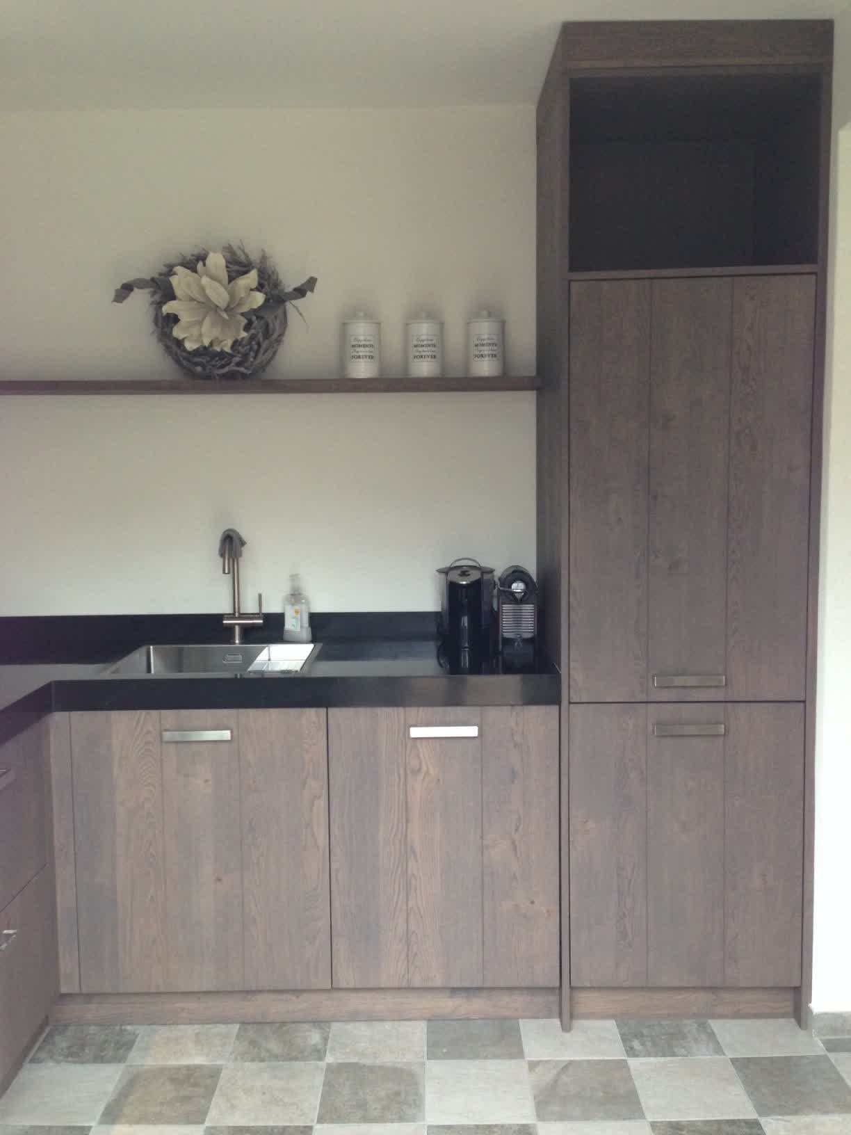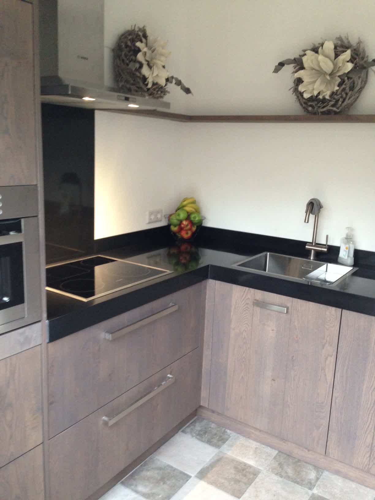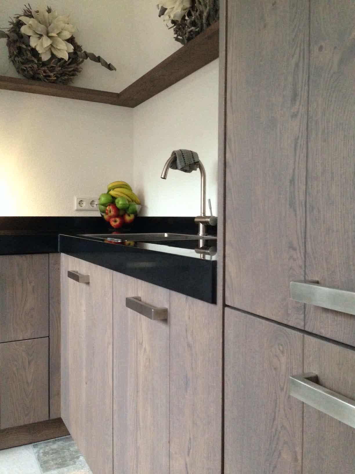 Deze eikenhouten keuken is afgewerkt in een grey wash. In de deuren en laden zijn v-groefjes gefreesd om het planken effect te benadrukken. Het blad is gemaakt van zwart Hi-macs. De RVS apparatuur is van Bosch, dit RVS komt ook terug in de grepen en andere details in de keuken.