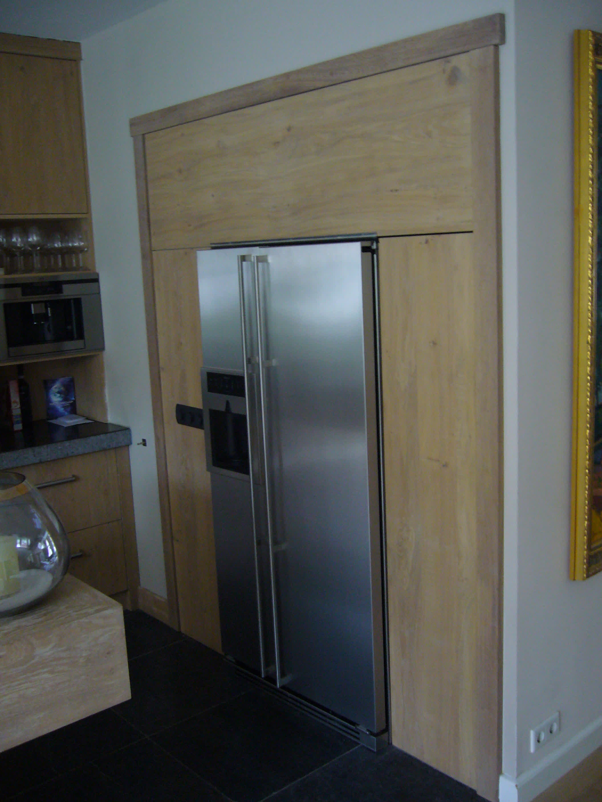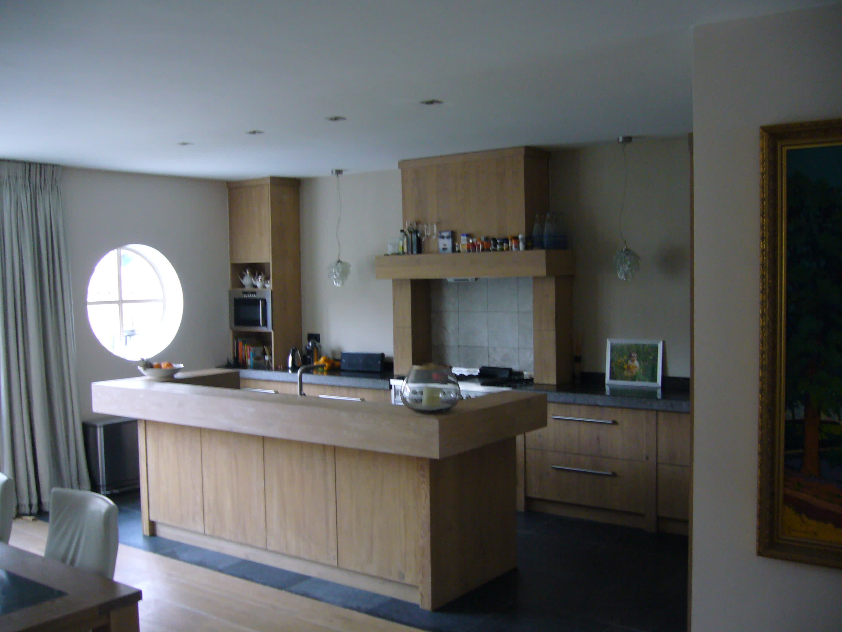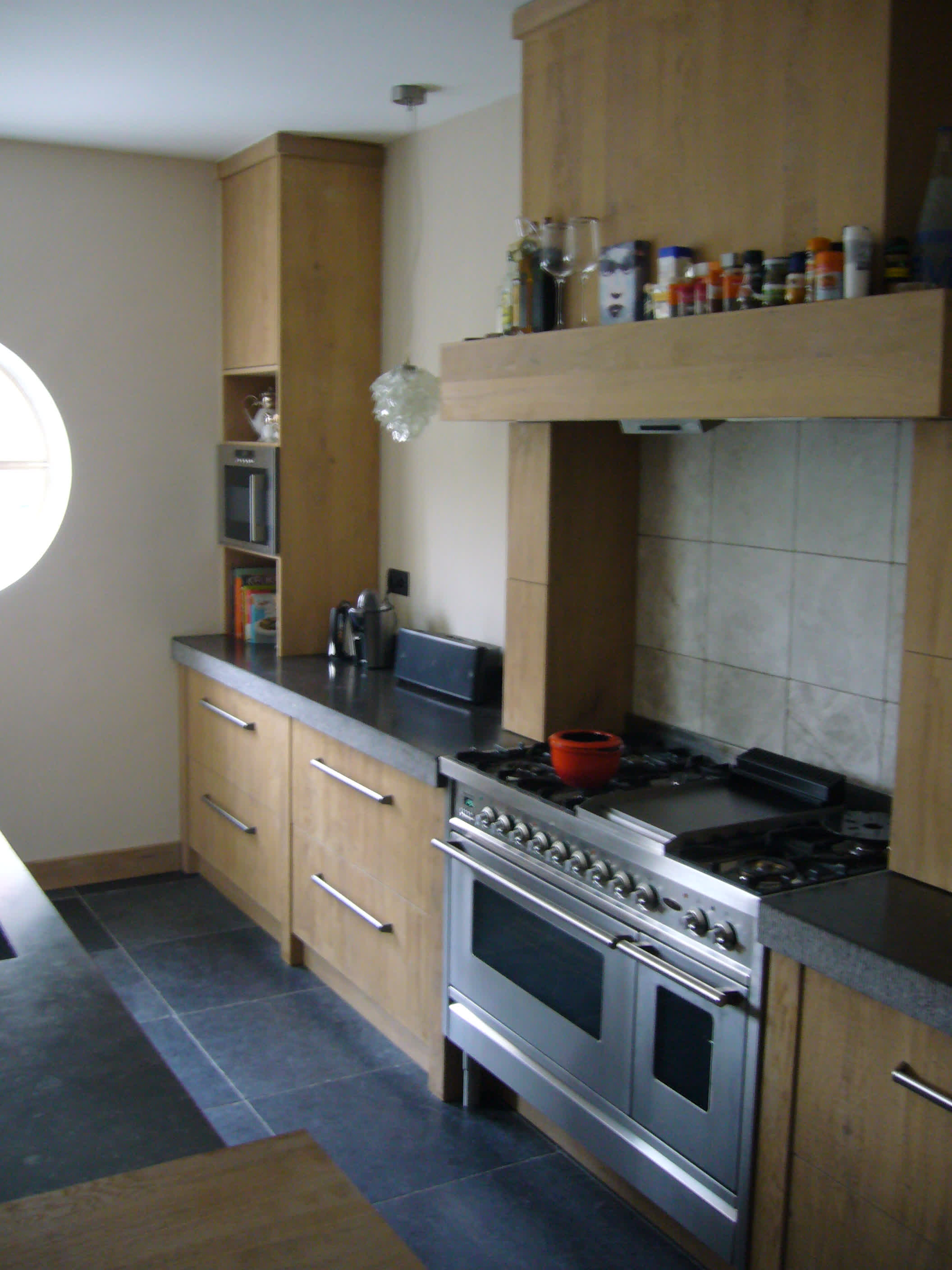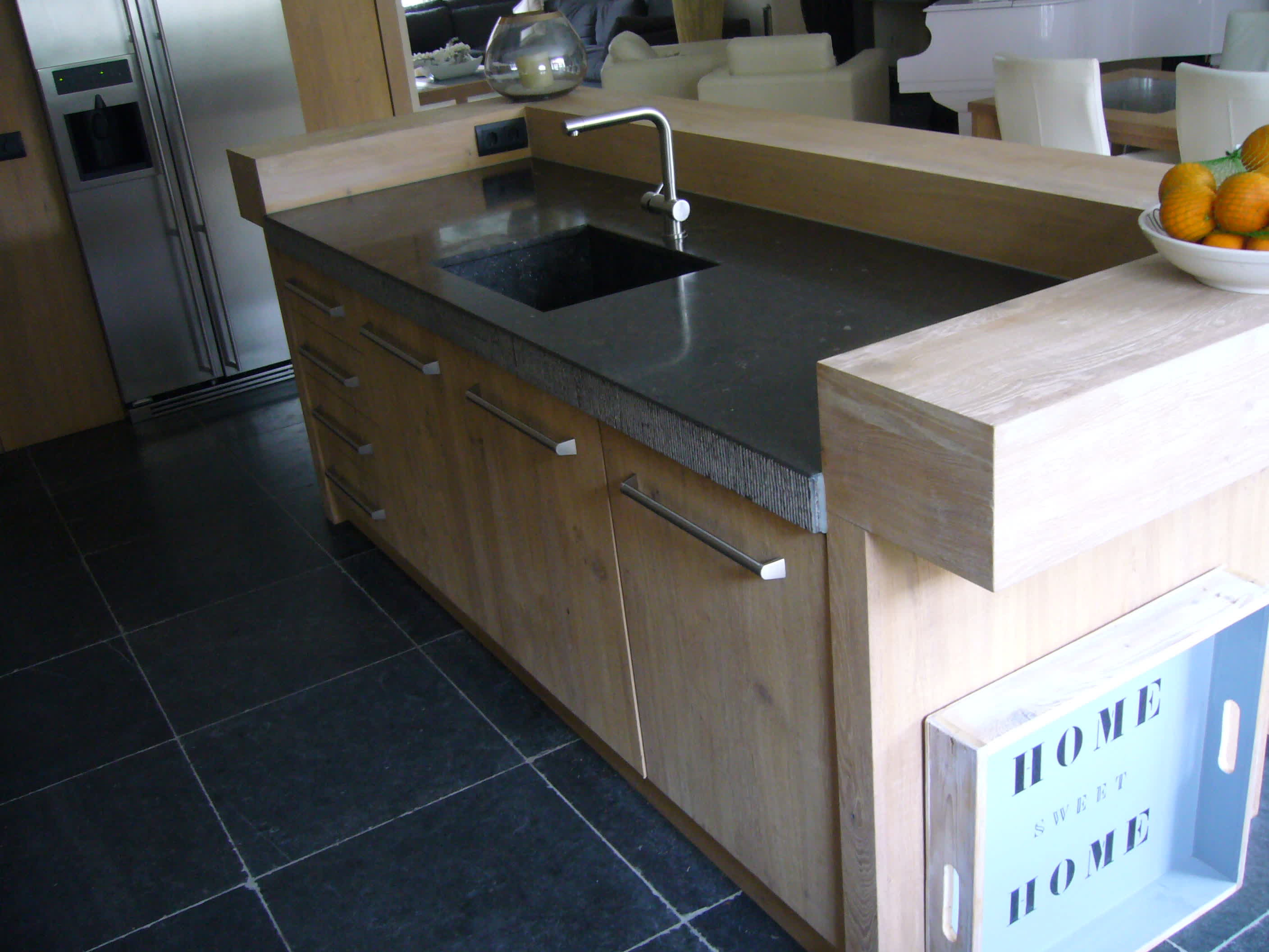 Deze keuken is gemaakt van geborsteld eikenfineer. Het blad is gemaakt van natuursteen, hierop lopen de eikenhouten schouw met afzuigkap en kast door. Waardoor het een mooi samenhangend geheeld wordt. De keuken is afgewerkt met een white wash olie.